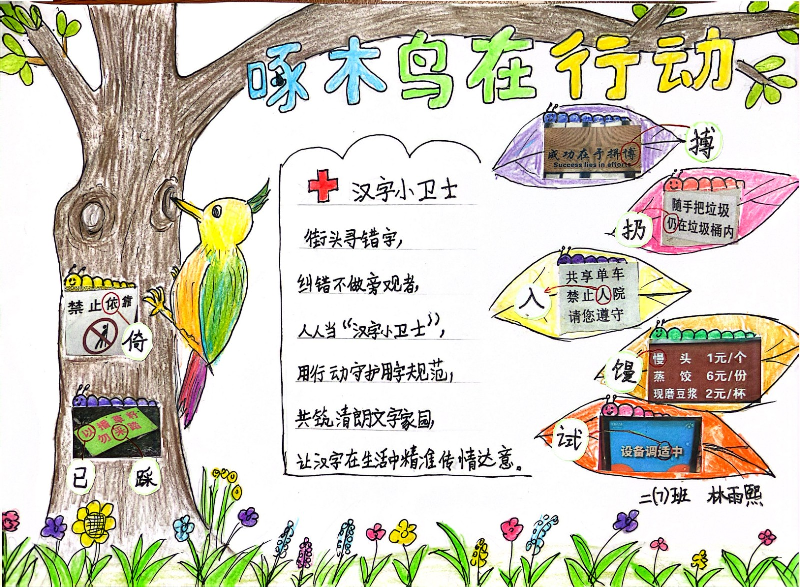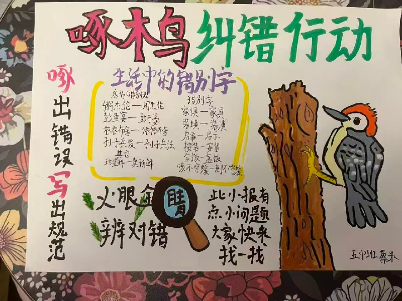 一年级到五年级的“啄木鸟”们化身汉字小医生,带着镜头和纸笔穿梭校园内外,捕捉错别字、繁简混用、异体字和拼音瑕疵,用图文报告的形式为城市“诊脉开方”。