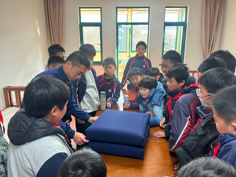 随后,同学们走进消防员的寝室,开启了一场“生活技能探秘”。在消防员的示范下,大家近距离观看了“豆腐块”被子的叠制过程:从铺平、折痕到压实、塑形,每一步都精准细致,展现出严谨的作风。在消防员的耐心指导下,同学们也纷纷上手尝试,认真模仿每一个细节,在动手实践中体会纪律与规范的意义。